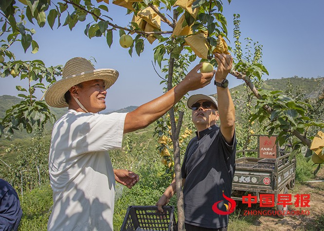 中国早报 山西讯(记者 赵玉虎)8月3日,山西省乡宁县管头镇山上村的郭青明玉露香梨种植基地采摘园里,游客往来穿梭,热闹非凡。这片60余亩的果园,种植着 800余棵玉露香梨和 500 余棵绿宝石梨,现场采摘每斤6元,年收入可达30余万元。