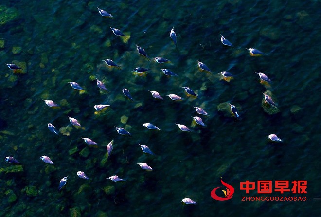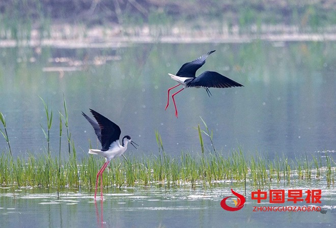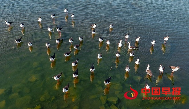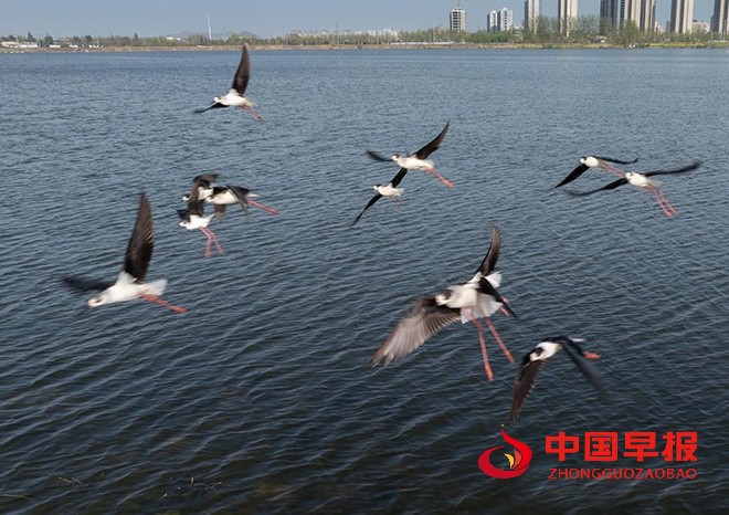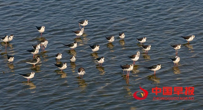 中国早报 安徽讯(记者 赵玉虎 通讯员 赵雪华)4月6日,安徽省淮北市湖面上,阳光轻柔波光粼粼,一群水鸟正惬意栖息。瞬间抓住了我的目光,带来了意外之喜。它们亭亭玉立在浅水域,身姿格外修长,黑白交织的羽衣,简约又尽显高雅,恰似出自顶级设计师之手的精美礼服,在日光下闪烁着柔和光泽。那双腿细长且鲜艳,如同一缕缕随风飘动的红绫,在浅水中轻轻点踏,每一个动作都带着独有的韵律,仿佛在与水泽轻声细语,谱写着只属于它们的浪漫篇章。