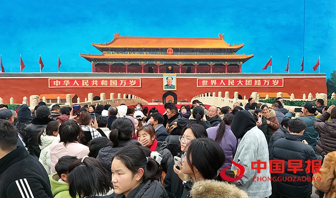 中国早报 河南讯(特约记者 李新义)1月1日,河南商丘市睢阳区闫集镇吴营村热闹非凡,一幅巨型 “天安门” 墙绘前挤满了慕名打卡的游客。