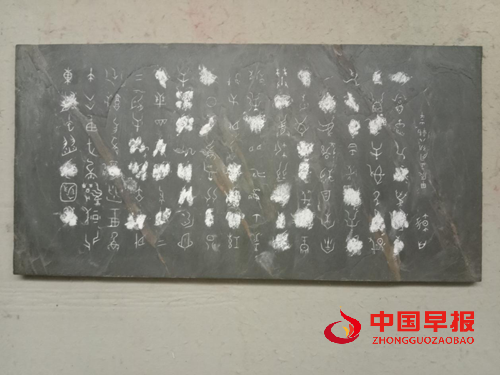 我们在韩山平老师的工作室,他回忆起作品创作的起始,指着那块长60厘米、宽30厘米、重5.816公斤的石板说道:“面对这块石板,我满心都是对创作的期待与敬畏。为了完成这个作品,我耗时近五个多月完成草稿。这首《沁园春·雪》全文总计118字,其中破译甲骨文就有32字,如何将它们完美地镌刻在石板上,成了我那段时间日夜思考的问题。”