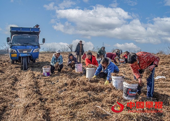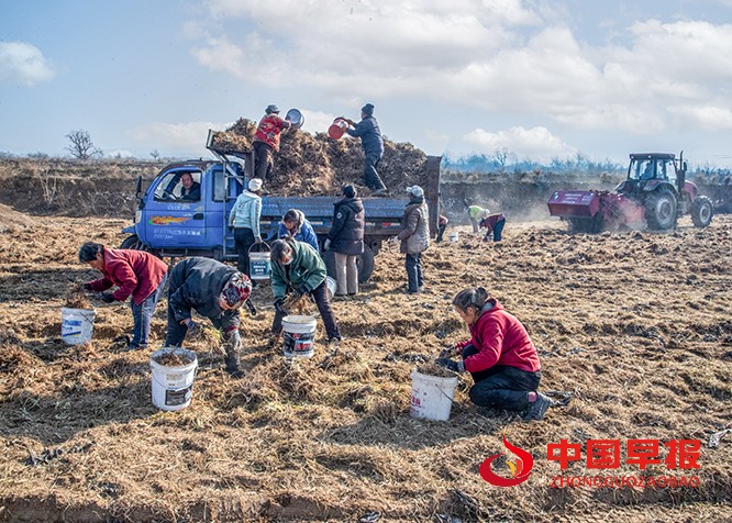 中国早报 山西讯(特约记者 田红萍)12月7日,襄汾县陶寺乡张再村的知母种植田里,一派热火朝天的丰收景象。广袤的田野上,村民们分工协作、干劲十足:有的操作药材挖掘机穿梭田间,高效采挖知母;有的手持铁锹,仔细将知母从泥土中翻出、拍净;还有的围在田垄旁,熟练地给知母去杂、分拣、装袋,每一道工序都有条不紊。